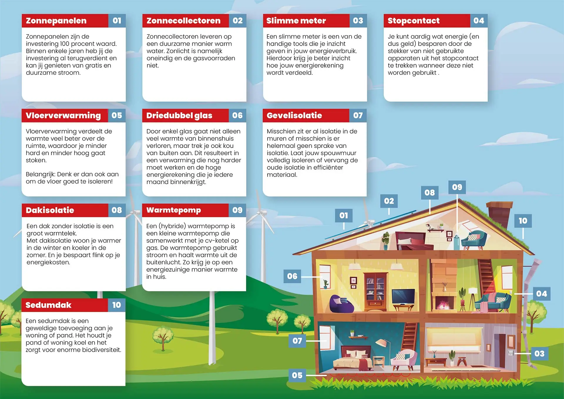 Je woning kun je op verschillende manieren goed isoleren. Onderstaande infographic laat de 10 beste tips zien. Hier vallen kleine thuis gewoontes onder zoals het verwijderen van stekkers uit je stopcontact maar ook grotere investeringen die je huis voor de langere termijn verduurzamen.