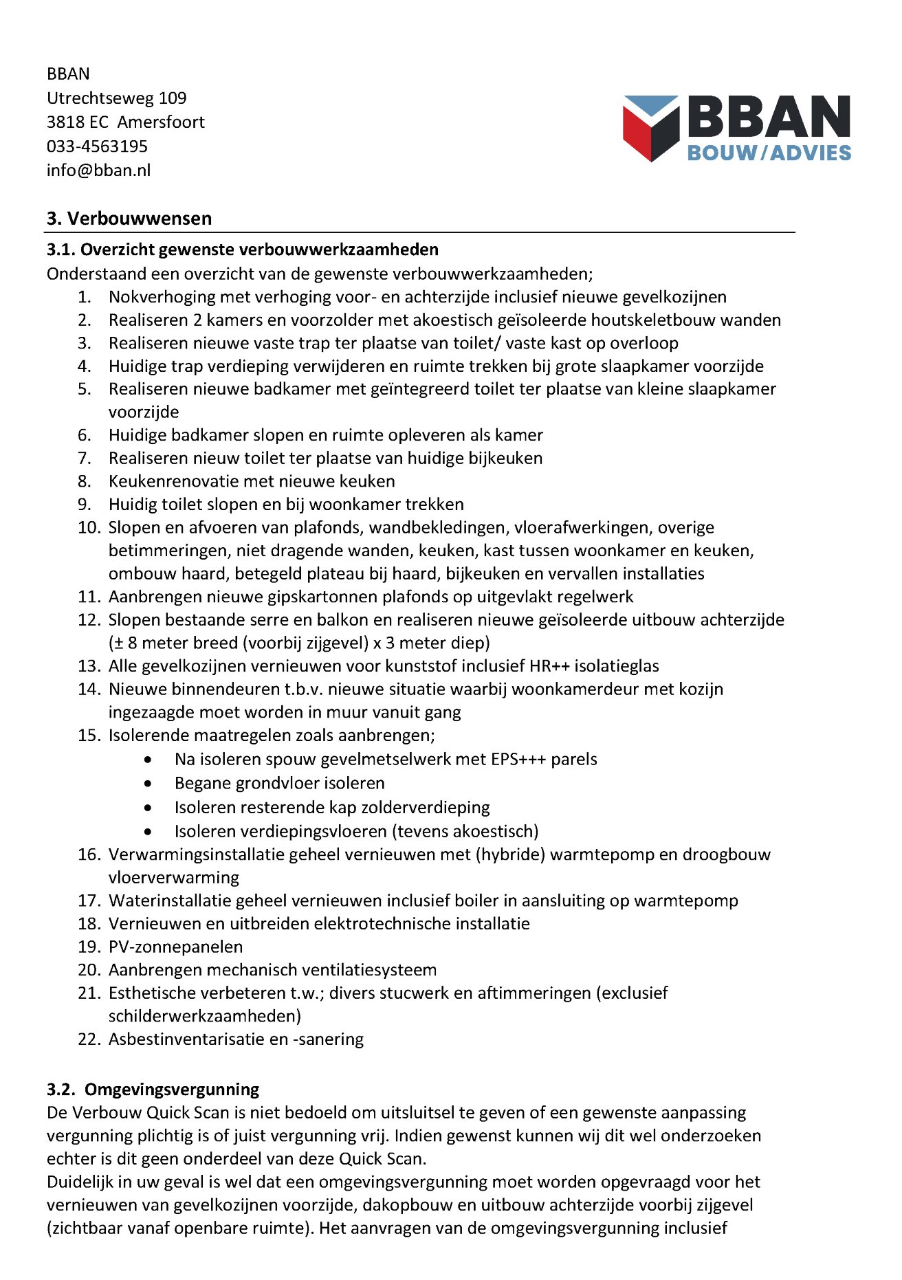 Voor de BBAN Verbouw Quick Scan zal een van onze bouwkundigen uw woning ter plekke inspecteren. Hij of zij kijkt naar alle bouwkundige, constructieve (denk aan een stabiliteitsberekening), bouwfysische (bijvoorbeeld juiste toepassing van isolatiemateriaal) en installatietechnische aspecten van de verbouwing. Voor specifieke vraagstukken (brandveiligheid, inbraakpreventie) schakelt hij of zij zo nodig specialisten in.